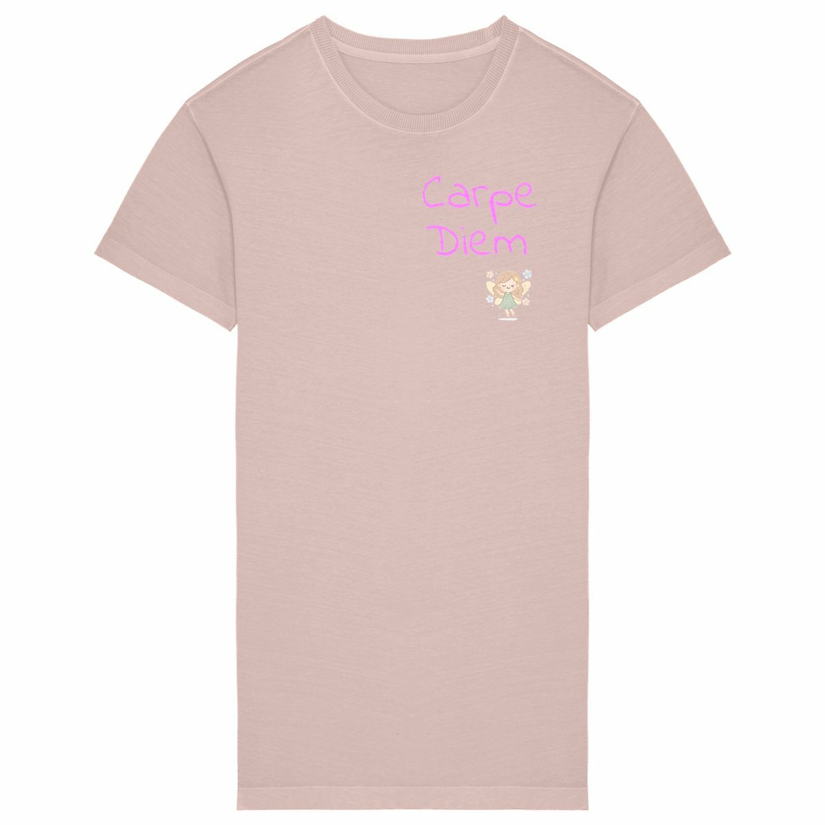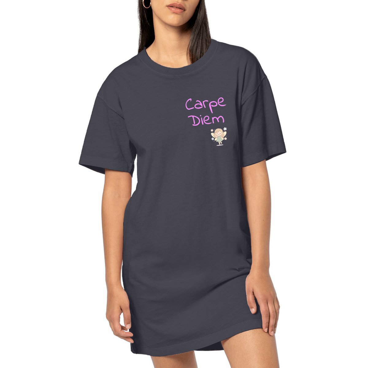 Découvrez notre robe T-shirt Vintage Femme ornée d’une illustration féerique inspirée de la phrase emblématique ‘Carpe Diem’.