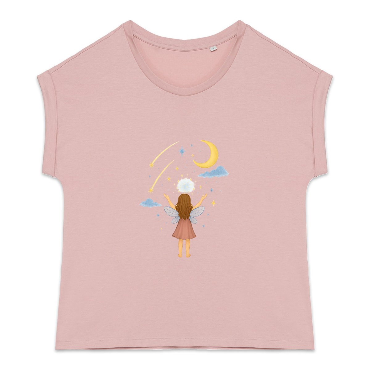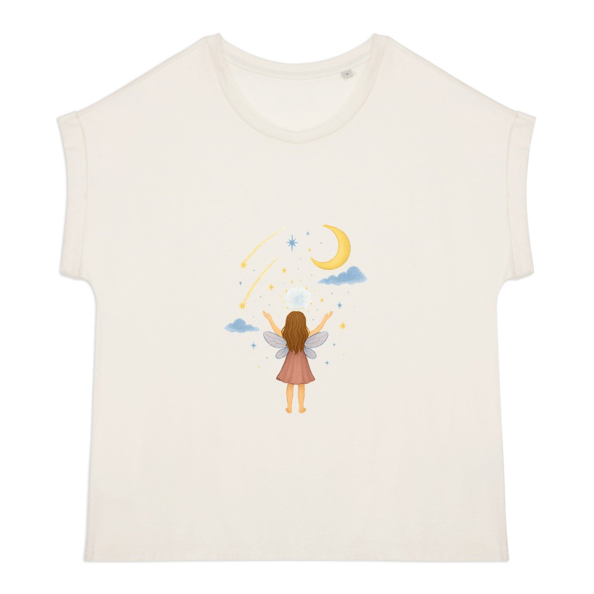 Découvrez notre T-shirt femme biologique manches à revers, orné d’une magnifique illustration d’une fée ouvrant les bras sur une poussière d’étoile.